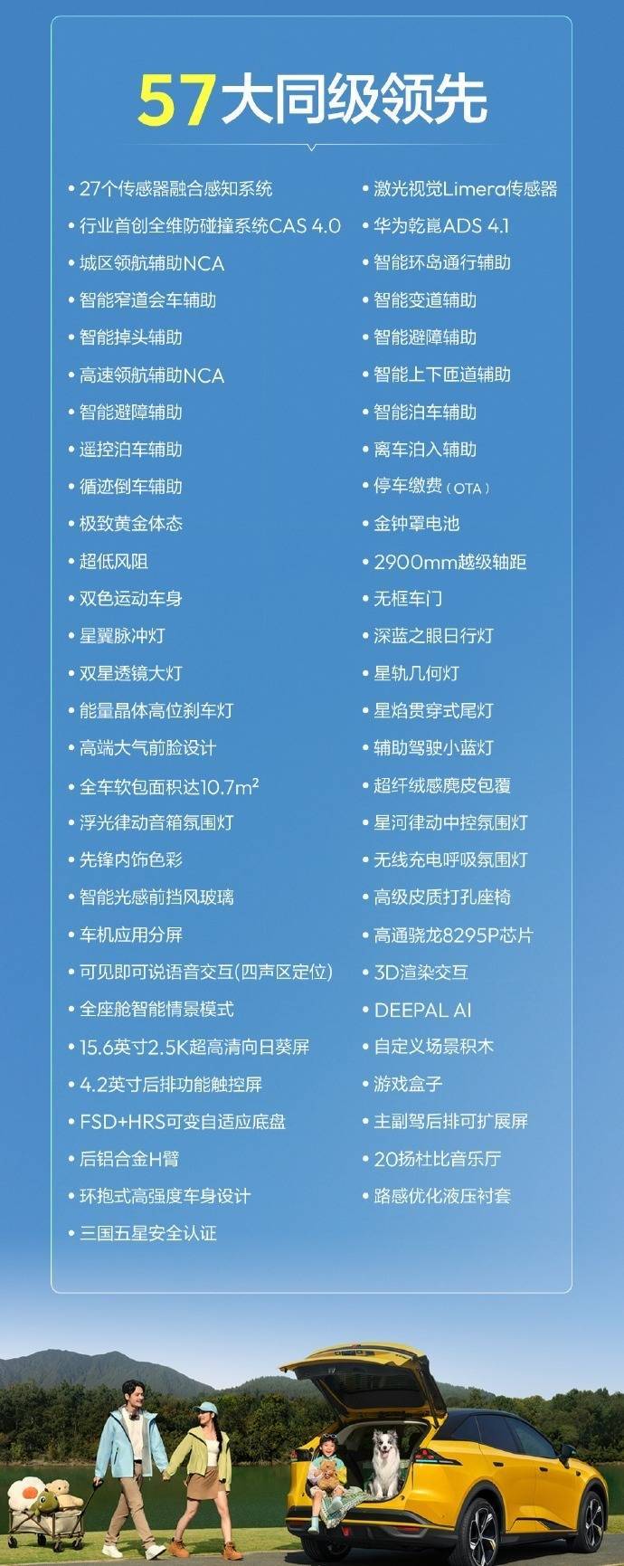 此外,该车还拥有12项同级首发配置,包括园区领航辅助、柔性桌面、AI语音形象、7.3.4多声道系统、深蓝OLED生态仪表屏、14向副驾零重力座椅、16向主驾零重力座椅、车载智能冷暖箱、睡眠空间、55英寸AR-HUD及纳米水离子负氧空调等。
