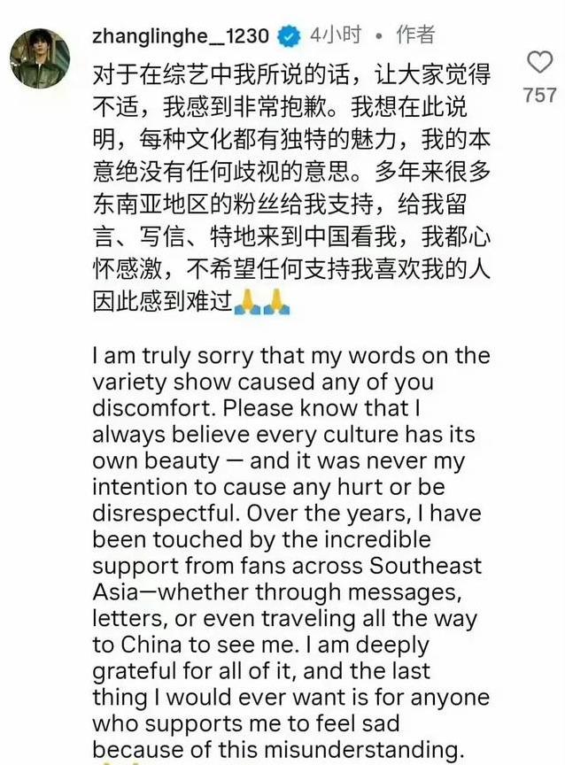 明星和观众,本是互相成就的关系。明星多点尊重,观众多点包容,圈子才能更健康。东南亚粉丝的生气,可以理解;张凌赫的道歉,也算及时。事情过去后,大家各自往前走。希望下次综艺里,看到的还是轻松的互动,而不是又一场风波。