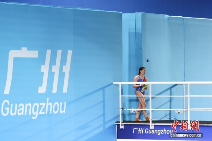 在广东省奥体中心游泳跳水馆举行的第十五届全国运动会跳水项目女子双人10米跳台预赛中,广东队全红婵/王伟莹成绩排名第三,晋级决赛。图为全红婵出场,准备比赛。中新社记者 陈楚红 摄