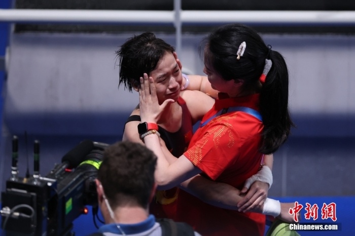 在巴黎奥运会跳水女子10米台决赛中,东京奥运会该项目冠军得主全红婵成功卫冕,陈芋汐获得亚军。图为全红婵和教练陈若琳拥抱。中新社记者 富田 摄