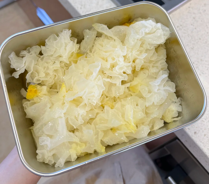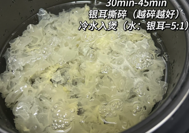 第四步,大火煮开转小火。开大火把水烧开,然后转小火慢慢熬煮。在煮的过程中,要不时地搅拌一下,防止银耳粘锅。大概煮 30 分钟后,你会看到银耳开始慢慢出胶,汤变得有点浓稠了。