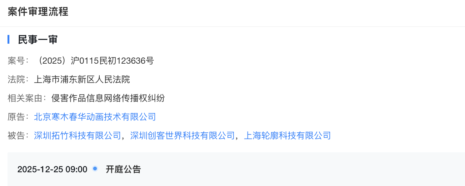事实上,向拓竹科技提起诉讼的不止泡泡玛特一家。据天眼查显示,此前,北京寒木春华动画技术有限公司也曾因“侵害作品信息网络传播权”向拓竹科技提起诉讼,寒木春华是知名动画作品《罗小黑战记》的版权方,目前案件已进入民事一审。